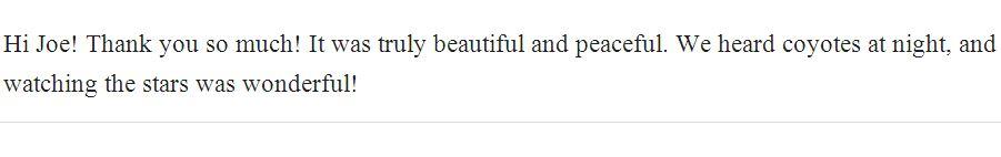 Terms: All guests agree to be respectful and tidy. All sales are final. Guests and Management agree to arbitrate any dispute regarding camp use and to act in mutual good faith.
